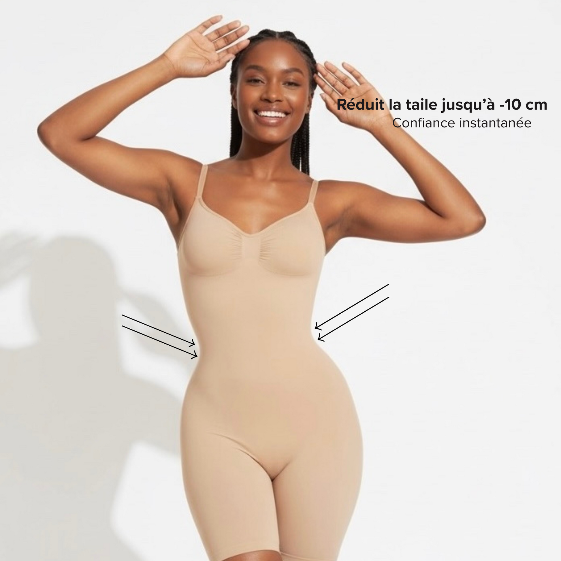 Un body gainant intégral qui affine la taille, lisse le ventre et sculpte les cuisses tout en soutenant naturellement la poitrine — sans armature, sans rembourrage.