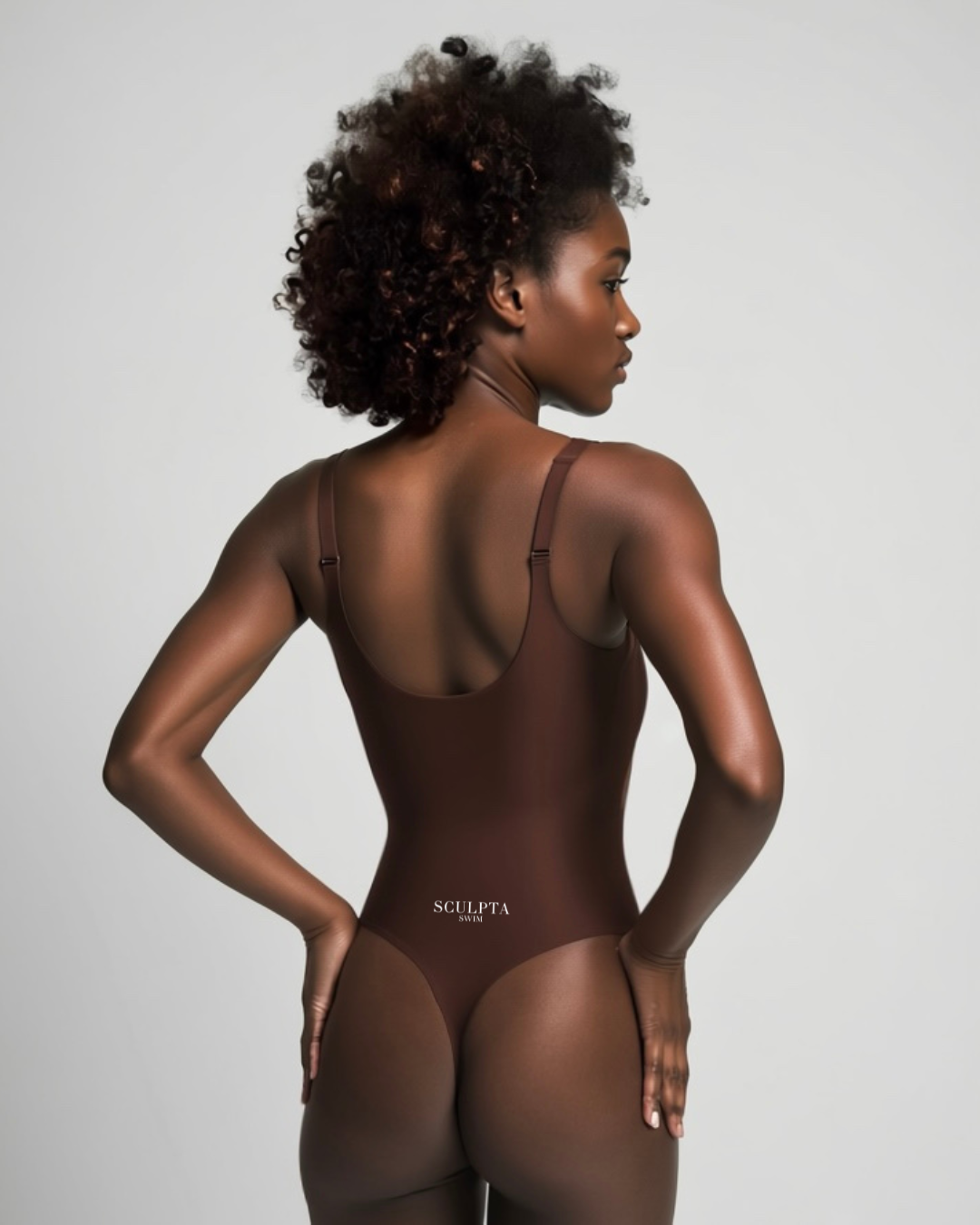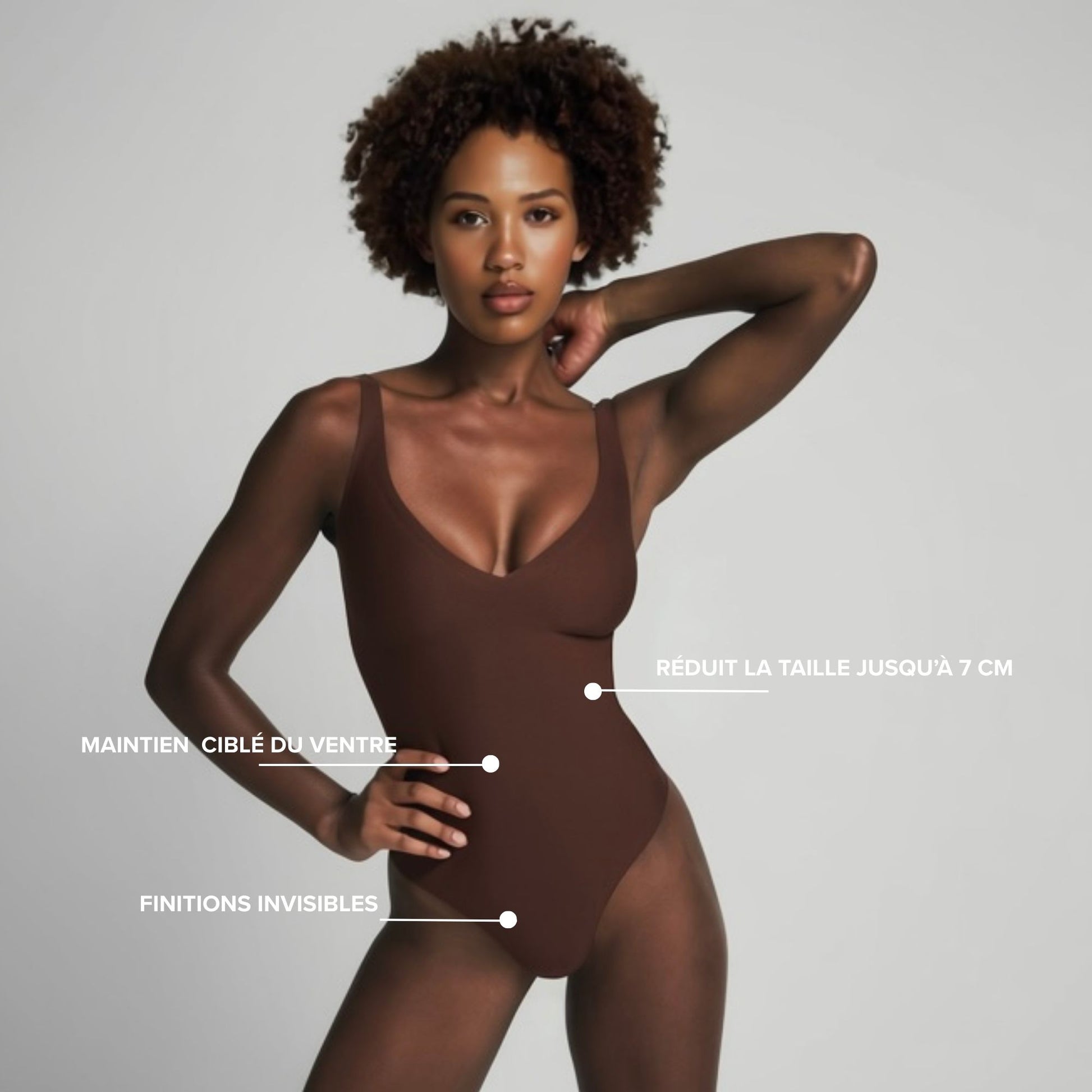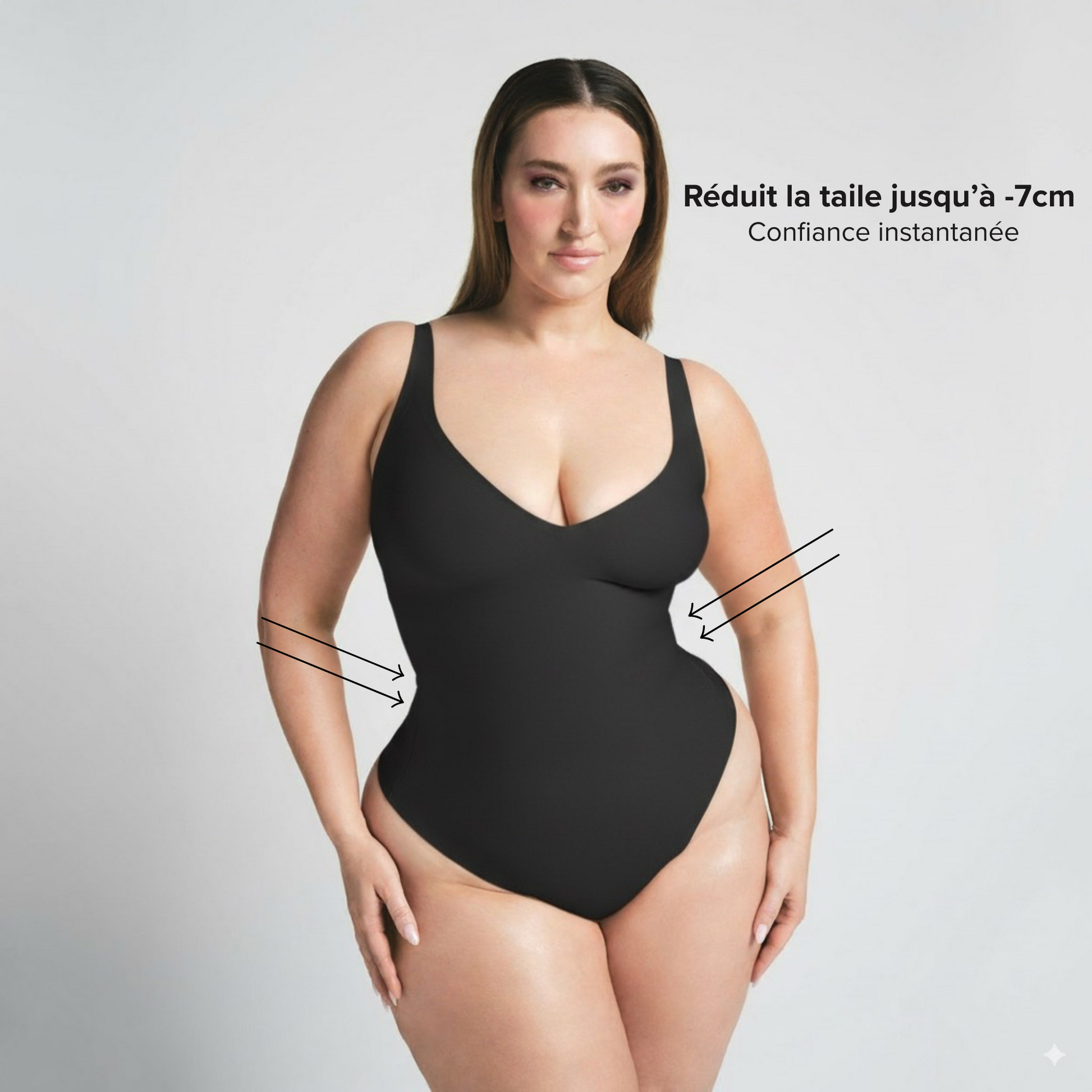 Un body sculptant à décolleté profond qui affine la taille, lisse le ventre et soutient naturellement la poitrine — sans armature, sans rembourrage.